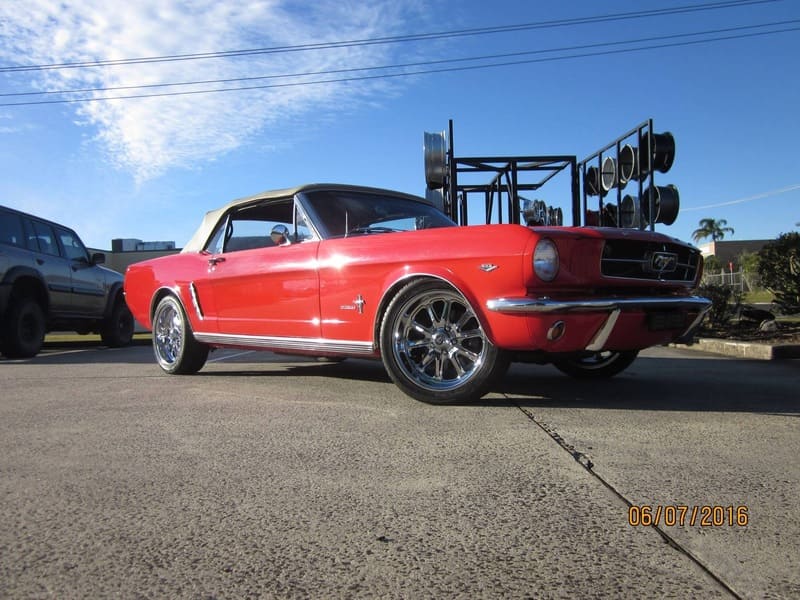 Red Ford Mustang convertible with chrome wheels