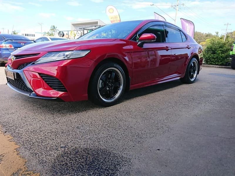 Red Toyota Camry sedan with black alloy wheels